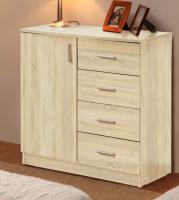 Качественный комод "Дуэт-5" для гостиной, выполненный в современном дизайне. Он включает четыре выдвижных ящика на роликовых направляющих и один большой отсек с полкой и глухой распашной дверцей. Три нижних ящика и дверца выполнены в приятном светлом оттенке, а верхний тёмный ящик идентичен по цветовому решению с корпусом, исключение составляет модель в однотонном исполнении. В комплект комода входят пластиковые подпятники, служащие для защиты напольного покрытия.
