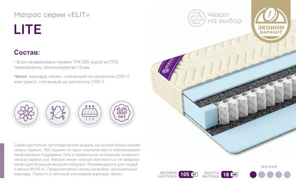 Самая доступная ортопедическая модель на основе блока независимых пружин. 500 пружин на одно спальное место обеспечивают необходимую поддержку тела и правильное положение позвоночника во время сна. Матрас имеет низкую жесткость и не предназначен для большой весовой нагрузки. Подойдет для людей с весом около 80-90 кг. Предусмотрены чехлы на выбор: экономичный жаккард «Трикот» и прочный хлопковый жаккард «Aries».
