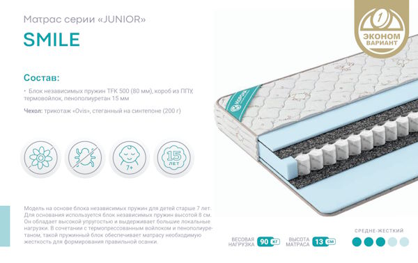 Модель на основе блока независимых пружин для детей старше 7 лет. В данном матрасе используются пружины высотой 8 см. Они обладают высокой упругостью и выдерживают большие локальные нагрузки. В сочетании с термопрессованным войлоком и пенополиуретаном такой пружинный блок обеспечивает матрасу необходимую жесткость для формирования правильной осанки.