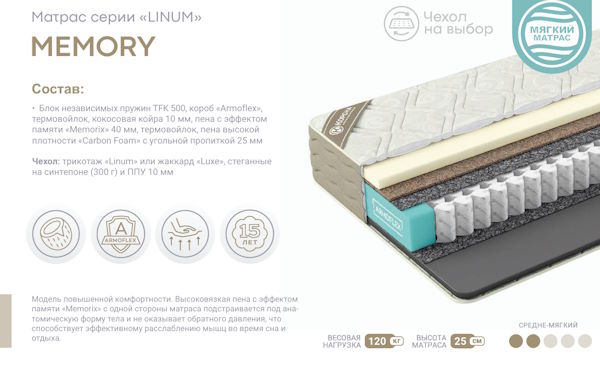 Модель повышенной комфортности. Высоковязкая пена с эффектом памяти «Memorix» с одной стороны матраса подстраивается под анатомическую форму тела и не оказывает обратного давления, что способствует эффективному расслаблению мышц во время сна и отдыха.