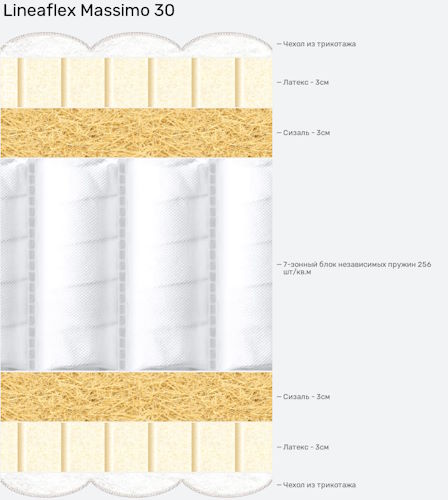 Высота матраса Массимо 30 см. Рекомендуемый вес нагрузки до 140 кг. Комплектуется элегантным съемным чехлом с перламутровым отливом из шелковой ткани TENCEL. Помимо основного нарядного чехла, модель покрыта защитным хлопковым трикотажем, который тоже можно снимать. Материал прекрасно дышит и защищает спальное место от влаги и микробов.