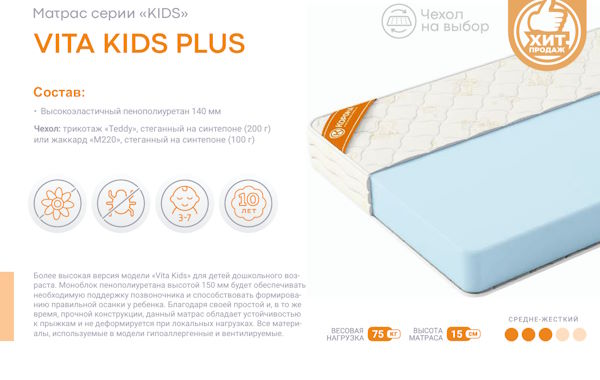 Более высокая версия модели «Vita Kids» для детей дошкольного возраста. Моноблок пенополиуретана высотой 150 мм будет обеспечивать необходимую поддержку позвоночника и способствовать формированию правильной осанки у ребенка. Благодаря своей простой и, в то же время, прочной конструкции, данный матрас обладает устойчивостью к прыжкам и не деформируется при локальных нагрузках. Все материалы, используемые в модели гипоаллергенные и вентилируемые.