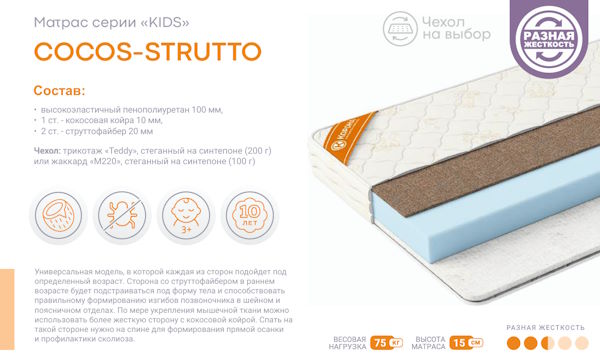 Универсальная модель, в которой можно менять жесткость по мере роста ребенка. Сторона со струттофайбером в раннем возрасте будет подстраиваться под форму тела и способствовать правильному формированию изгибов позвоночника в шейном и поясничном отделах. По мере укрепления мышечной ткани можно использовать более жесткую сторону с кокосовой койрой. Спать на такой стороне нужно на спине для формирования прямой осанки и профилактики сколиоза. Высокоэластичный пенополиуретан 100 мм, 1 ст. - кокосовая койра 10 мм, 2 ст. - струттофайбер 20 мм